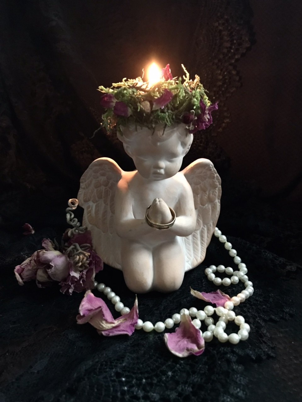 I chose this angel to top our enormous wedding cake. Elegant blown glass was a popular topper when we got married, but I was more than certain I wanted a simple Angel made of clay which I adorned with a halo of rosebuds. He was the proper symbol to crown the celebration of our marriage. Earthy and heavenly, gentle and peaceful. He’s lived in various glass cabinets over the years, becoming more tucked away as life passed.