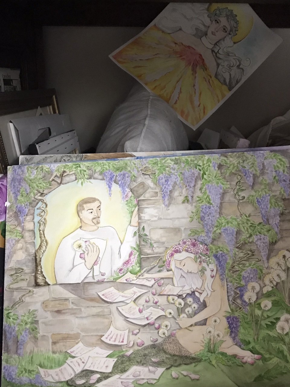I imagine a natural background for Mary and find a photo of you in your vineyard. I was certain I wanted it printed large months ago. I breathe in that certainty. I need a frame. As an artist, I have random frames tucked here and there. Down on my knees I see one that is the right size. A painting has slipped out of my drawer. Out of a stack of dozens. this is the one.