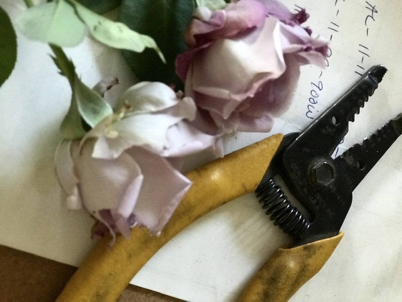 The purple roses are blooming outside your window, I borrowed your pliers so I could bring them in. I consider each bloom before I cut it- is it too early? Would another day allow it to open to perfection? Or would another day find it spent? Am I taking too many? The bees and the butterflies need them too. I take two, one for me, one for you.