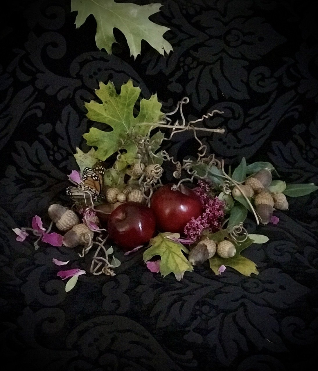 Over our table cloth I placed well used wedding gifts, pewter candle sticks and surrounded them with rosemary, acorns, grape tendrils, a few fallen leaves, keys to heaven and the last two deep red apples that were hanging from the tree this morning.
