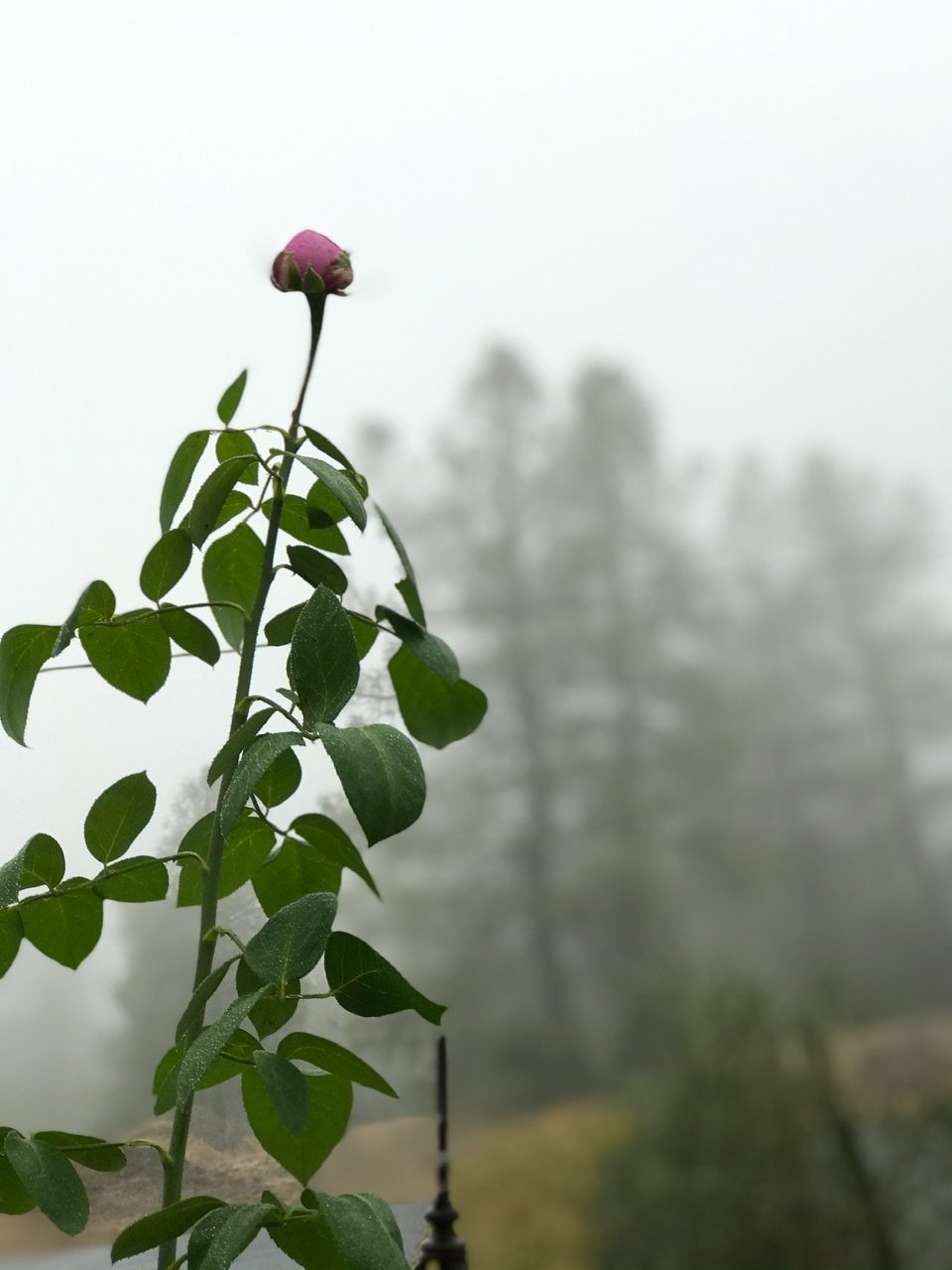 Misty clouds engulfed our mountain today , slowly swallowing up the view. I stepped outside to breath in the fresh watery air, the first winter rain falling so gently from the sky. As if I am gazing in a mirror, I take in the very last rose reaching up, it’s brightness clenched tight as it’s surrounded by the gray of this world.