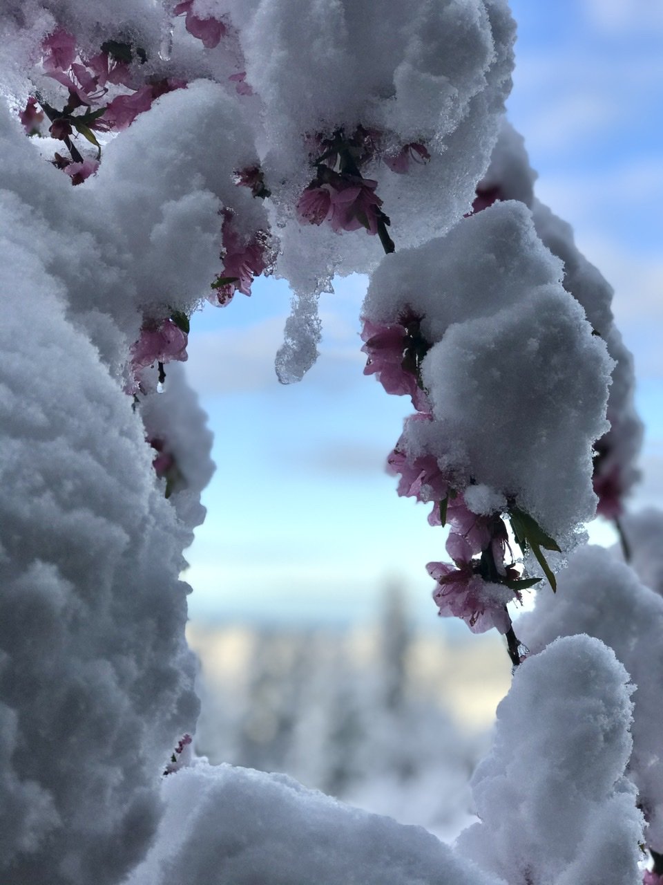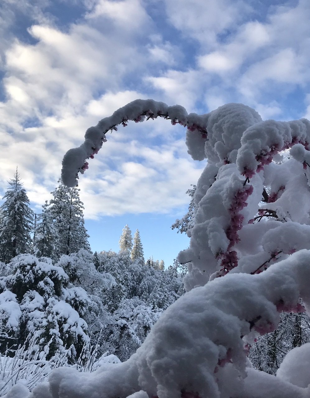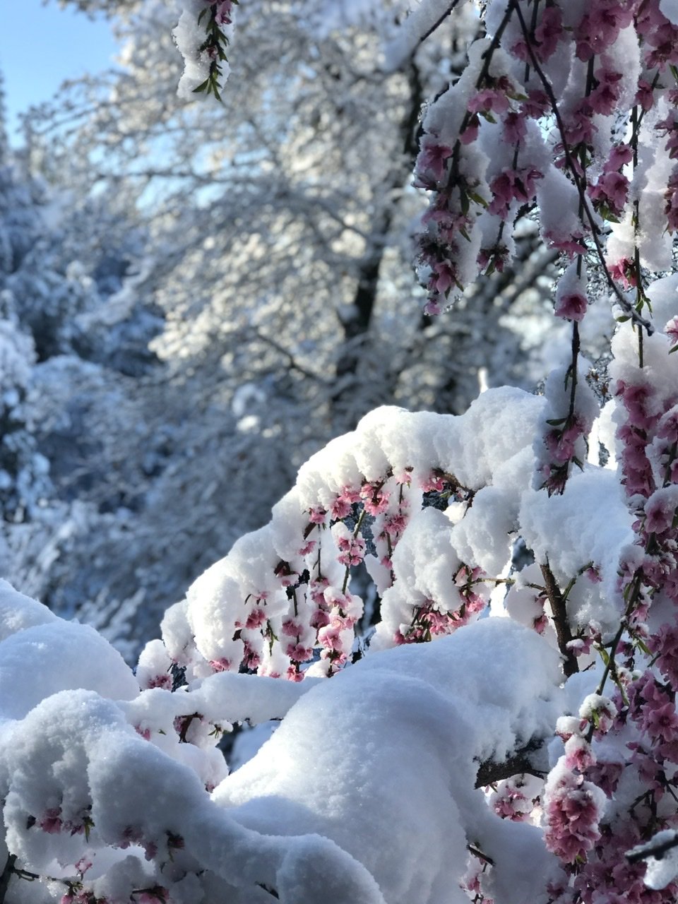 Draped in diamonds, our beloved blossoms bloomed elegant under the sparkling blanket gifted in the night. How could this wintry heaviness add such beauty? How? In the chill I both grieved and hoped. I grieved the loss of future fruit and hoped some would be protected and saved.
